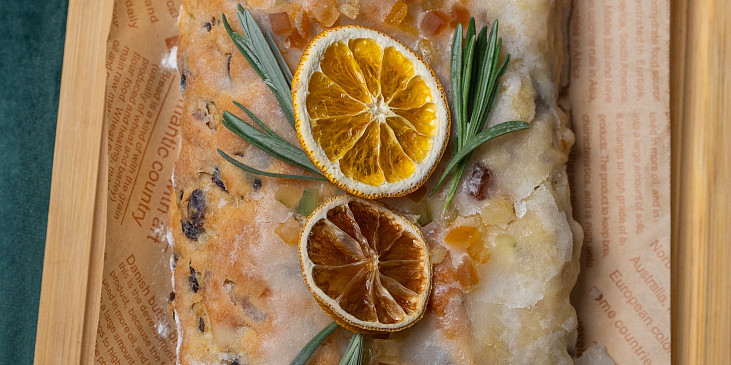 tvaroh, máslo, cukr krupice, vejce, podmáslí, mouka hladká, kypřící prášek do pečiva, rozinky, brusinky sušené, meruňky sušené, mandle, citron, sůl, mletý anýz, cukr moučkový, šťáva citronová, máslo, cukr moučkový, cukr vanilkový, ovoce kandované