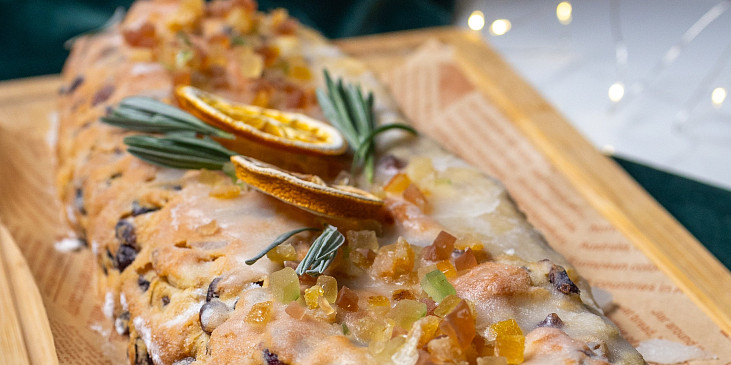 tvaroh, máslo, cukr krupice, vejce, podmáslí, mouka hladká, kypřící prášek do pečiva, rozinky, brusinky sušené, meruňky sušené, mandle, citron, sůl, mletý anýz, cukr moučkový, šťáva citronová, máslo, cukr moučkový, cukr vanilkový, ovoce kandované