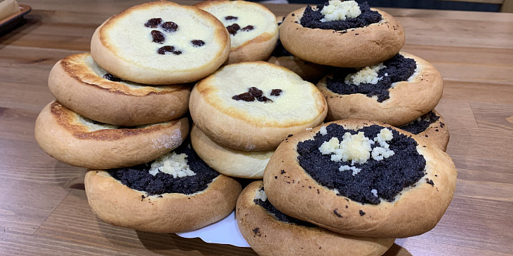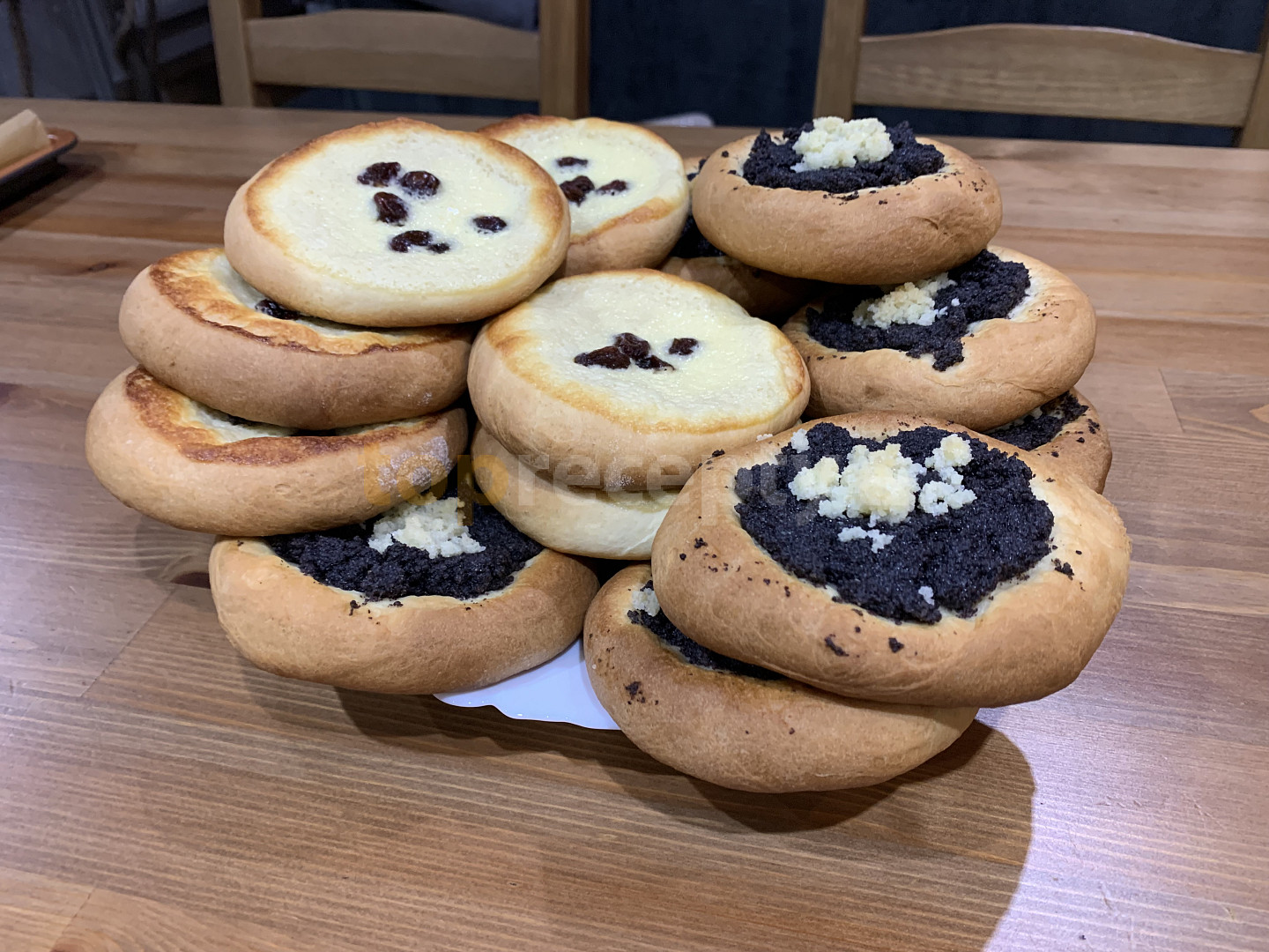 mouka hladká, cukr, sůl, cukr, žloutek, droždí, mléko, cukr vanilkový, žloutek, bílek, tvaroh, cukr moučkový, rozinky, mák, mléko, cukr, cukr vanilkový, mouka hrubá, máslo, cukr