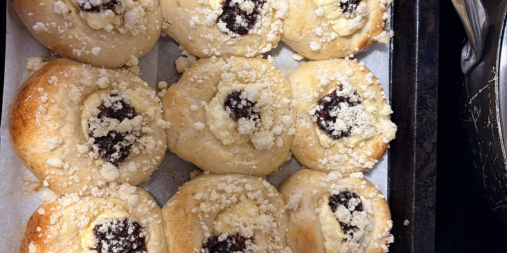 mouka hladká, droždí, cukr třtinový, mléko, máslo, žloutek, sůl, kůra citronová, vejce, tvaroh, cukr třtinový, vejce, kůra citronová, šťáva citronová, rum, pudink vanilkový, povidla švestková, rum, perník na strouhání, mouka polohrubá, cukr třtinový, máslo,