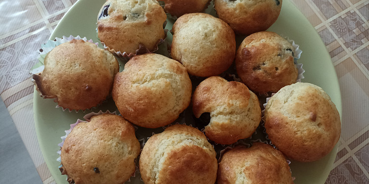 vejce, cukr krupice, cukr vanilkový, olej, tvaroh ve vaničce, mouka hladká, kypřící prášek do pečiva, borůvky, banán, rozinky, jablko, čokoláda