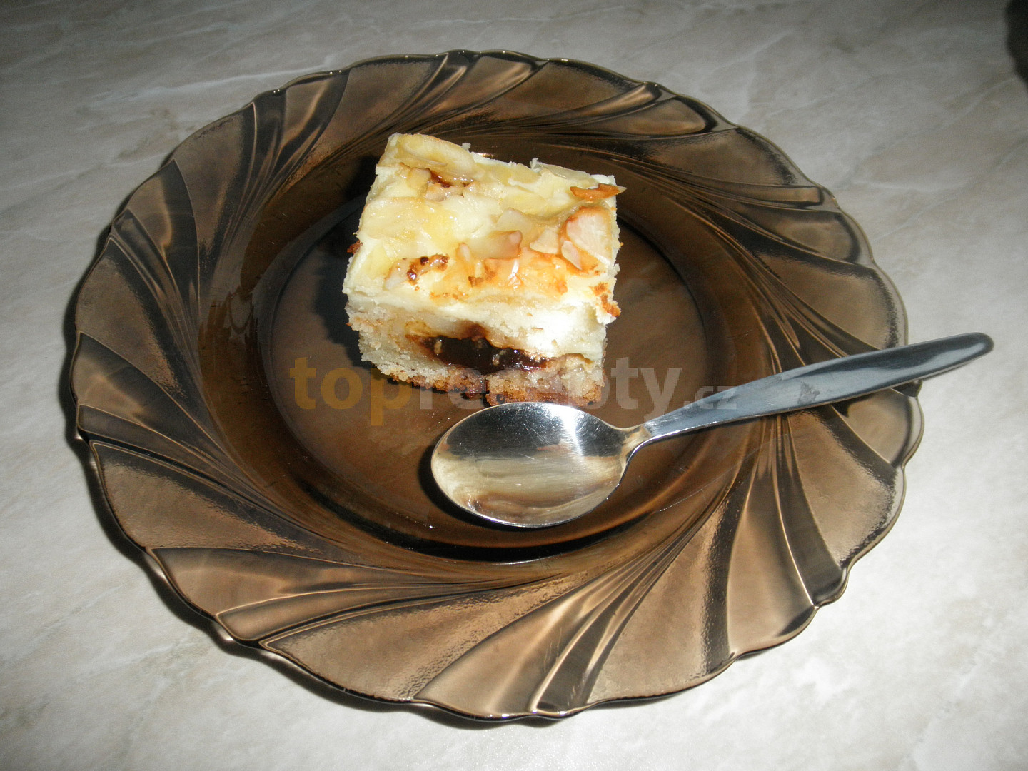 mouka hladká, vejce, cukr moučkový, mléko, olej, kypřící prášek do pečiva, tvaroh ve vaničce, cukr moučkový, cukr vanilkový, pudink vanilkový, vejce, mléko, rozinky, povidla švestková, lupínky mandlové, cukr moučkový