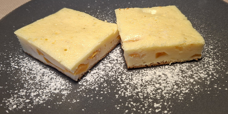 tvaroh, vejce, cukr moučkový, tuk hera, mléko, mouka polohrubá, cukr vanilkový, prášek do pečiva, kůra citronová, kompot broskvový, mouka polohrubá