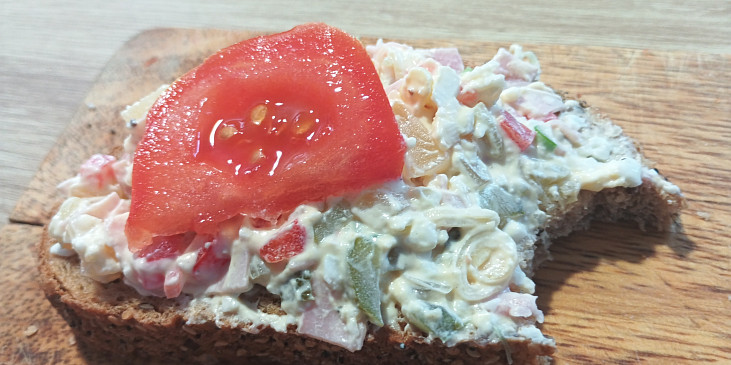 sýr tvarůžky kulaté, tvaroh, majolka, šunka, cibulka jarní, okurky sterilované, paprika čerstvá červená, vejce, sůl