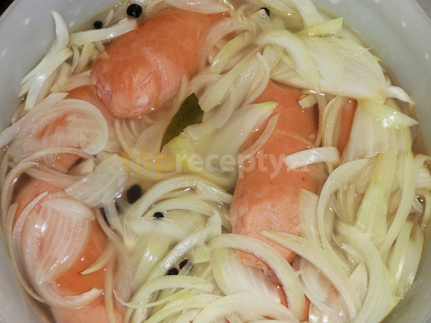 bobkový list, semínka hořčičná, ocet, sladidlo umělé, sůl, pepř, voda, koření nové koření, špekáček, cibule, bobkový list