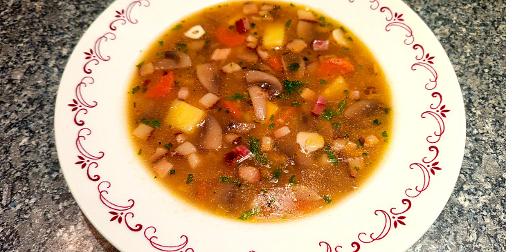 žampióny, brambory, mrkev, pórek, slanina, maso uzené, špek, cibule, česnek, sůl, pepř mletý, kmín drcený, omáčka sojová, krupice, voda, olej, petržel