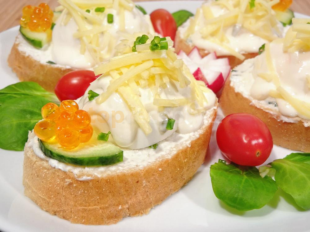 vejce, veka, máslo, hořčice, tatarská omáčka, sýr gouda, pomazánkové máslo, sůl, pepř mletý, okurka salátová, pažitka, kaviár