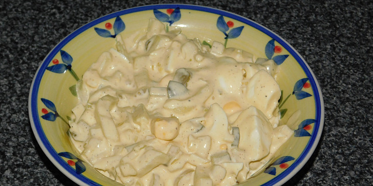 vejce, brambory, okurky sterilované, cibule, majonéza, sůl, pepř bílý mletý, hořčice, omáčka worcesterová, šťáva citronová, cukr