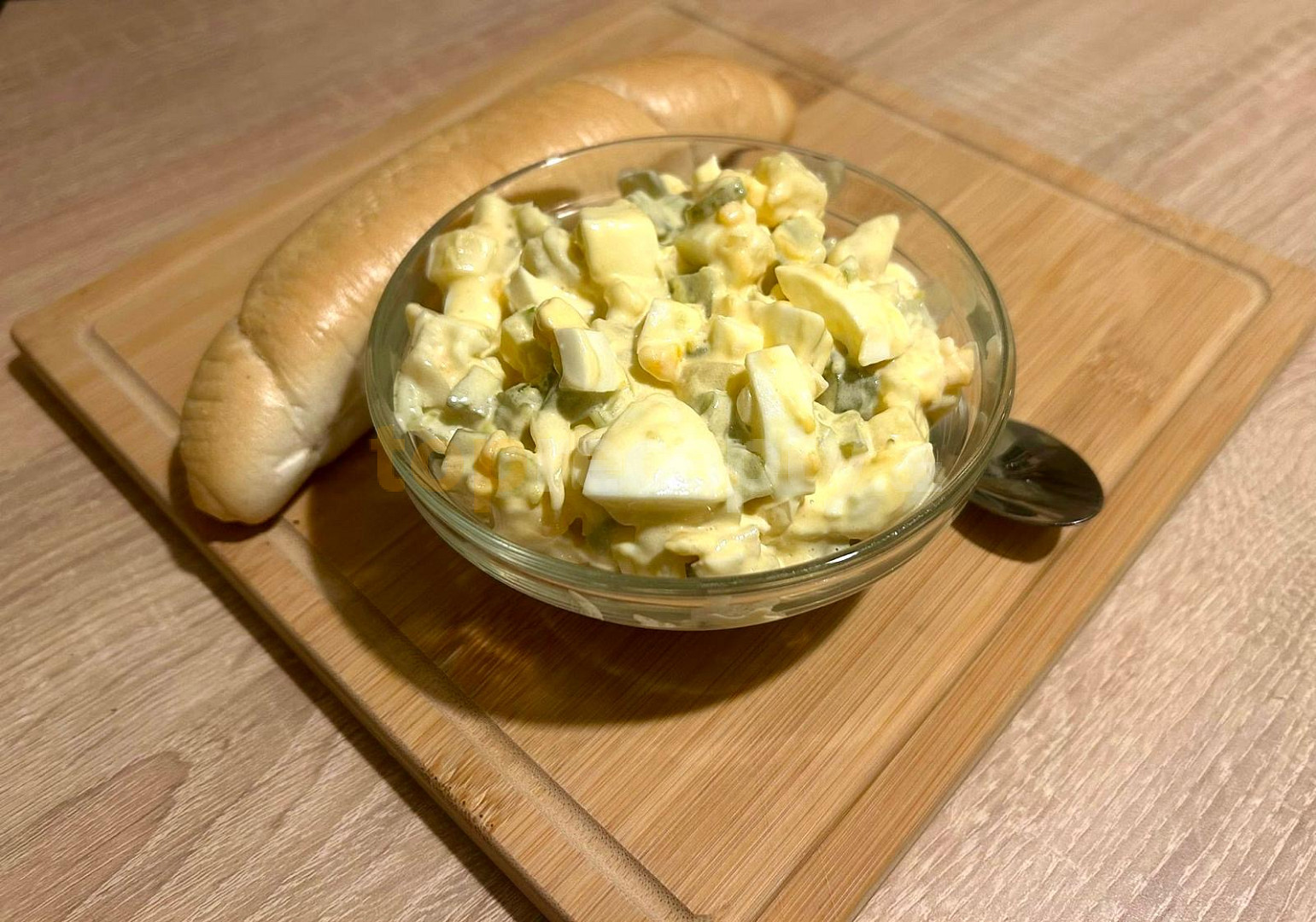 vejce, majonéza, brambory, okurky sterilované, cibule, hořčice plnotučná, ocet, sůl