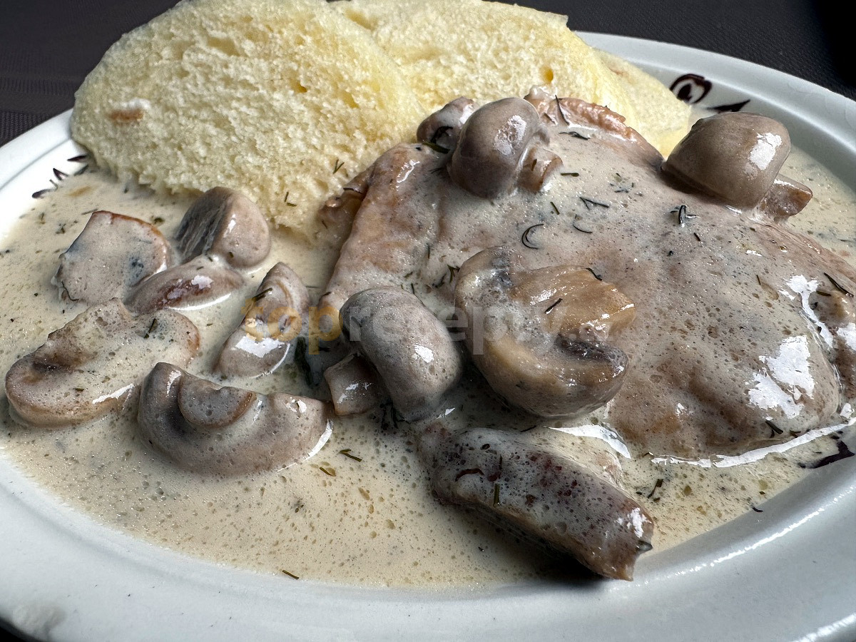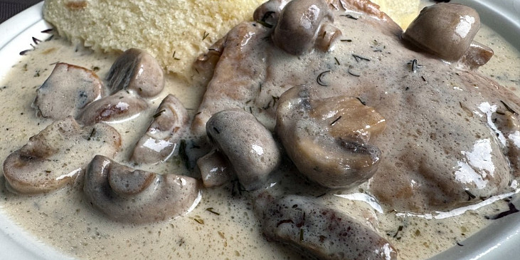 maso vepřové, sádlo, houby čerstvé, smetana zakysaná, máslo, mouka hladká, kopr, ocet, sůl