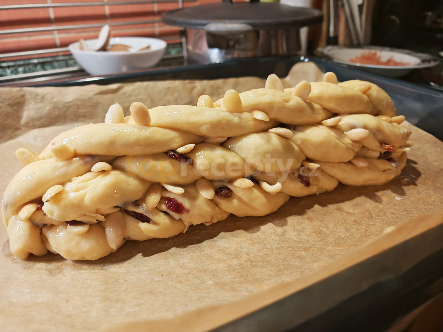 mouka polohrubá, mléko, cukr moučkový, droždí čerstvé, olej, máslo, rozinky, cukr vanilkový, žloutek, sůl, vánočka, mandle sekané, rozinky