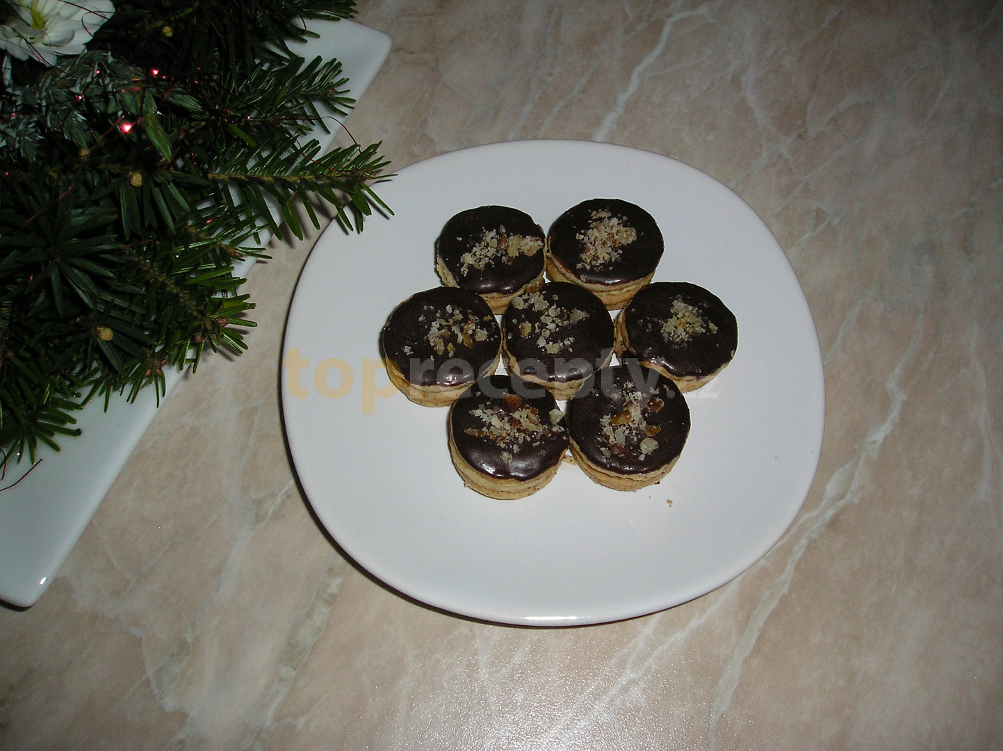 mouka polohrubá, ořechy lískové, cukr moučkový, máslo, šťáva citronová, skořice mletá, prášek do pečiva, marmeláda rybízová, rum, tuk, pudinkový prášek, mléko, cukr moučkový, máslo, cukr vanilkový, čokoláda na vaření, tuk ztužený,
