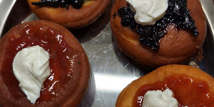 mouka hladká, mouka polohrubá, cukr krupice, mléko, droždí, vejce, máslo, kůra citronová, sůl, olej, smetana kysaná, šlehačka, marmeláda rybízová, povidla švestková