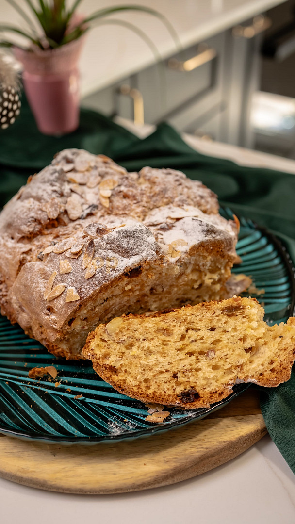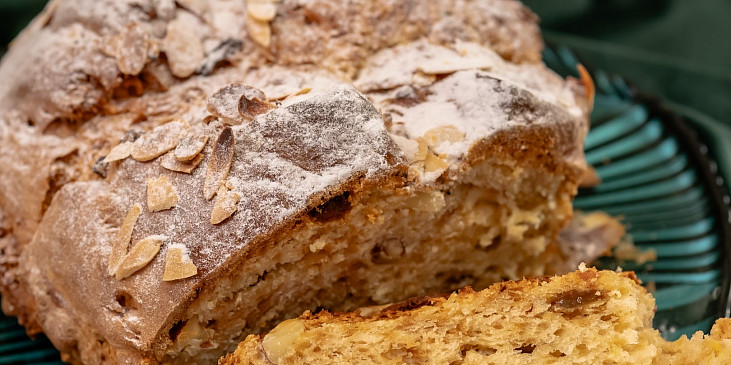 mouka hladká, tvaroh měkký, cukr krystal, máslo, vejce, kypřící prášek do pečiva, cukr vanilkový, kůra citronová, mandle sekané, rozinky, rum, vejce, mandle plátkové