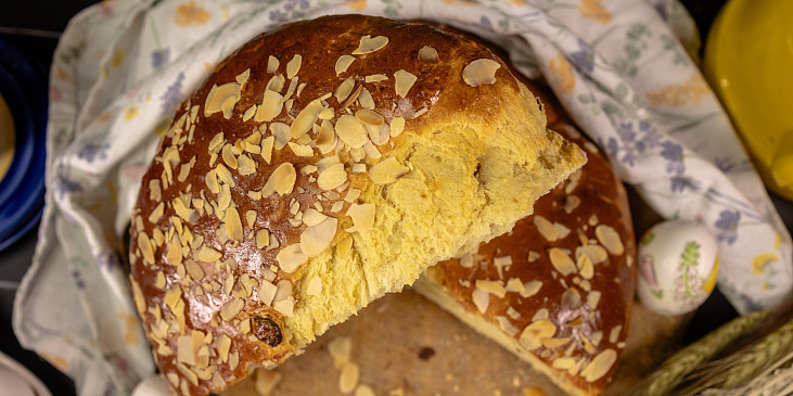 mouka polohrubá, mléko plnotučné, droždí čerstvé, cukr krystal, máslo, žloutek, cukr vanilkový, sůl, citron, mandle loupané, rozinky, rozinky, ořech muškátový, vejce, mandle plátkové