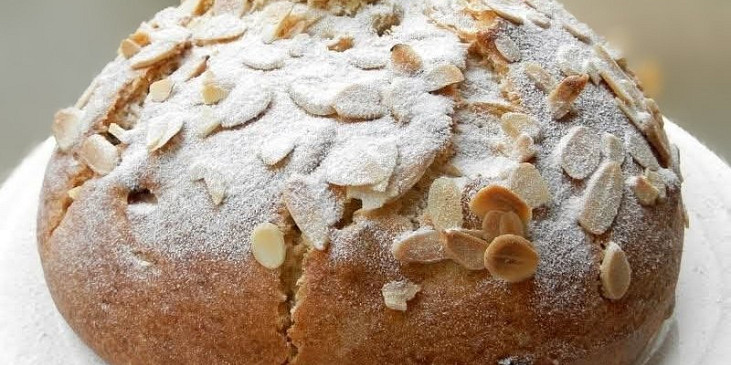 mouka hladká, máslo, cukr moučkový, žloutek, sůl, droždí čerstvé, mléko, kůra citronová, vanilka, rozinky, mandle, lupínky mandlové, vejce