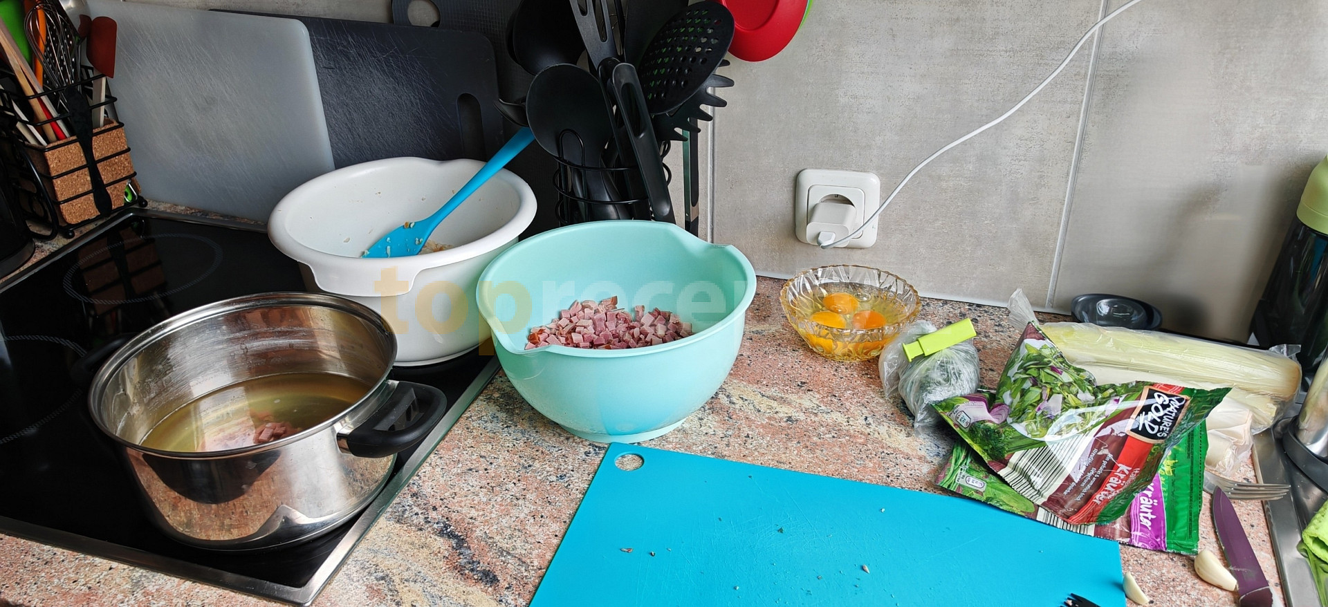 houska, vejce, bok uzený, kopřivy, citron, mléko, zázvor mletý, petrželka, pepř mletý, sůl, sádlo