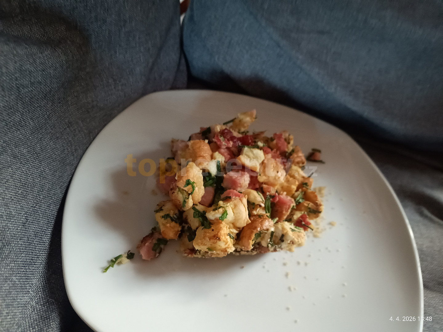 rohlík, mléko, vejce, šunka, nať petrželová, pažitka, vegeta bio, kmín celý, sůl, pepř mletý, máslo, strouhanka