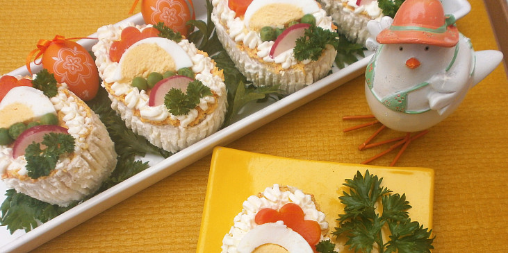 chléb toustový, pomazánkové máslo, mrkev, máslo, česnek, sůl, paprika sušená sladká, vejce, mrkev, ředkvičky, hrášek, petrželka