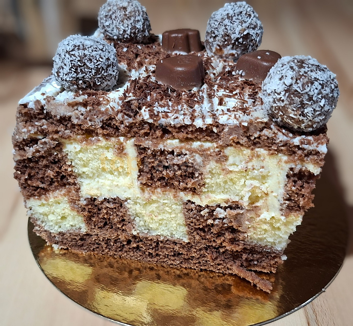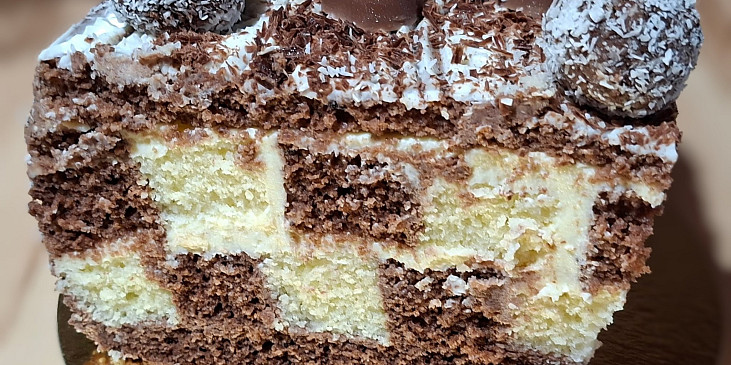 mouka polohrubá, cukr krupice, mléko, vejce, kypřící prášek do pečiva, olej rostlinný, kakao, mouka polohrubá, cukr krupice, mléko, vejce, kypřící prášek do pečiva, olej rostlinný, kakao, mouka polohrubá, cukr krupice, mléko, vejce, kypřící prášek do pečiva, olej rostlinný, smetana ke šlehání, čokoláda na vaření, tvaroh, mléko, pudink vanilkový, tvaroh, máslo, cukr vanilkový, cukr krupice, rum, kokos strouhaný, čokoláda, zdobení