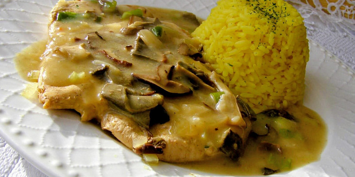 pečeně vepřová, sůl, pepř mletý, cibule, špek, olej, máslo, houby, mouka hladká, vývar masový, mouka polohrubá, mléko, rohlík, vejce, sůl, petrželka, olej