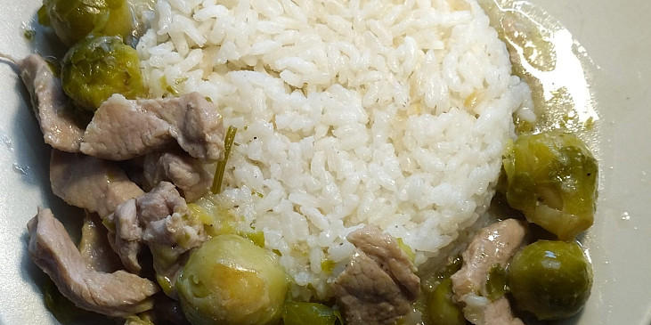 sádlo, cibule, plec vepřová, kapusta růžičková, bobkový list, kmín mletý, paprika sušená sladká, sůl, pepř mletý, gustin, vývar masový, brambory