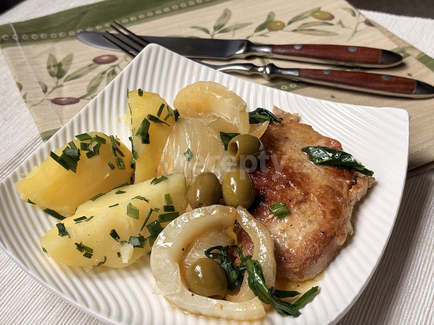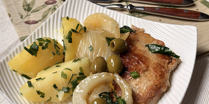 kotleta vepřová bez kosti, fenykl, olivy zelené, česnek mědvědí, víno bílé suché, vývar masový, olej olivový, sůl, pepř citronový