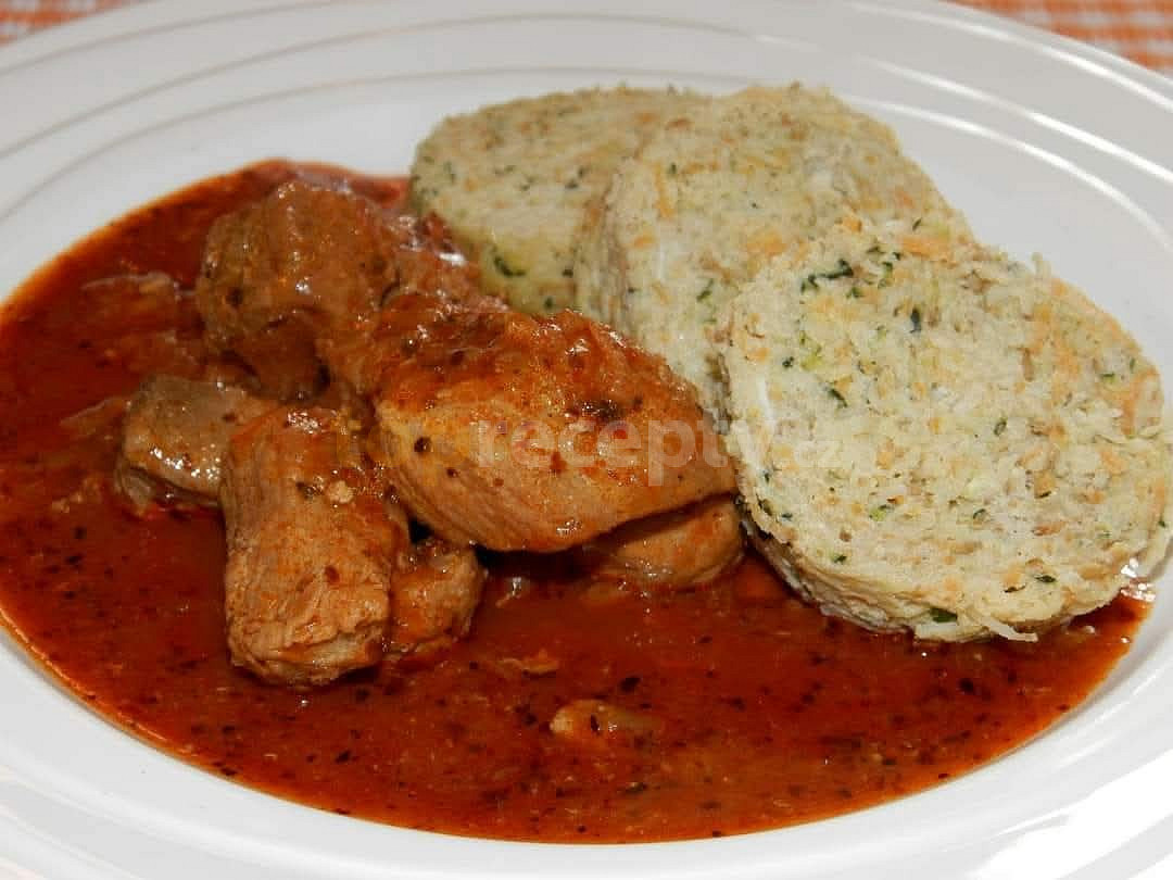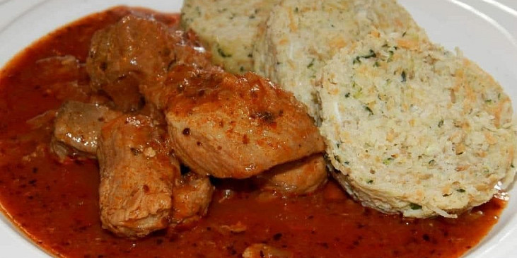 sádlo, cibule, maso vepřové, sůl, pepř mletý, kmín drcený, paprika sušená sladká, koření gulášové, česnek, majoránka, cuketa, celer, mrkev, vejce, sůl, pepř mletý, máslo
