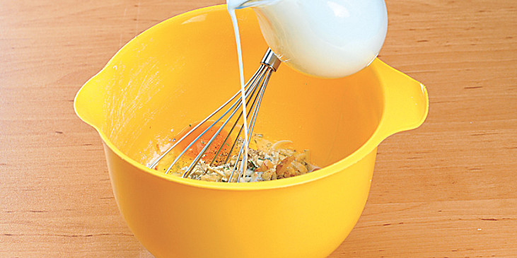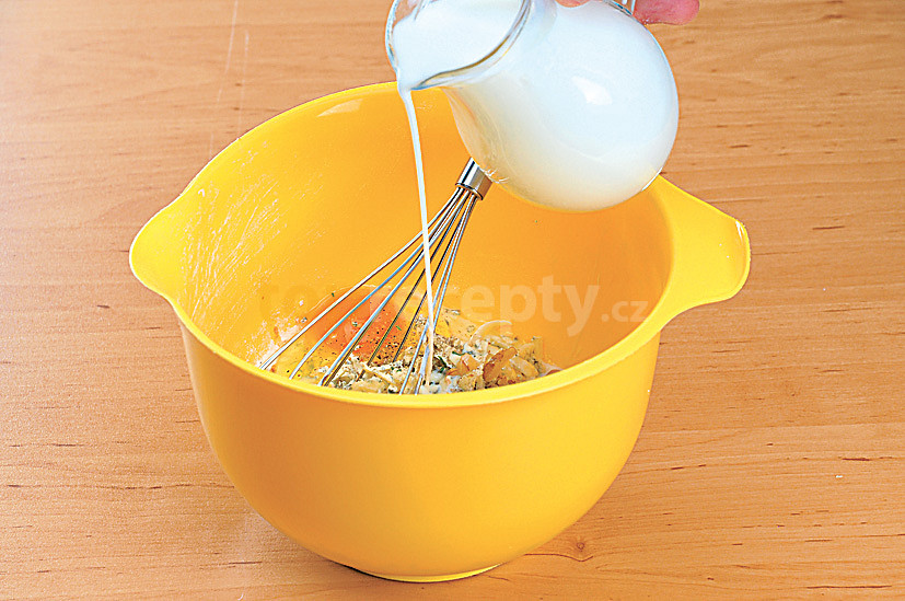 pečeně vepřová, ořechy vlašské, sýr niva, mouka hladká, vejce, cukr krupice, pivo světlé, paprika sušená sladká, mléko, petrželka, sůl, pepř mletý, olej, brambory, cibule, olej, sůl, pepř mletý
