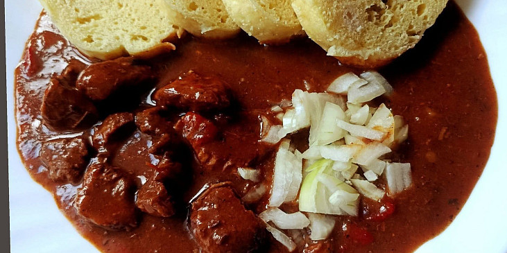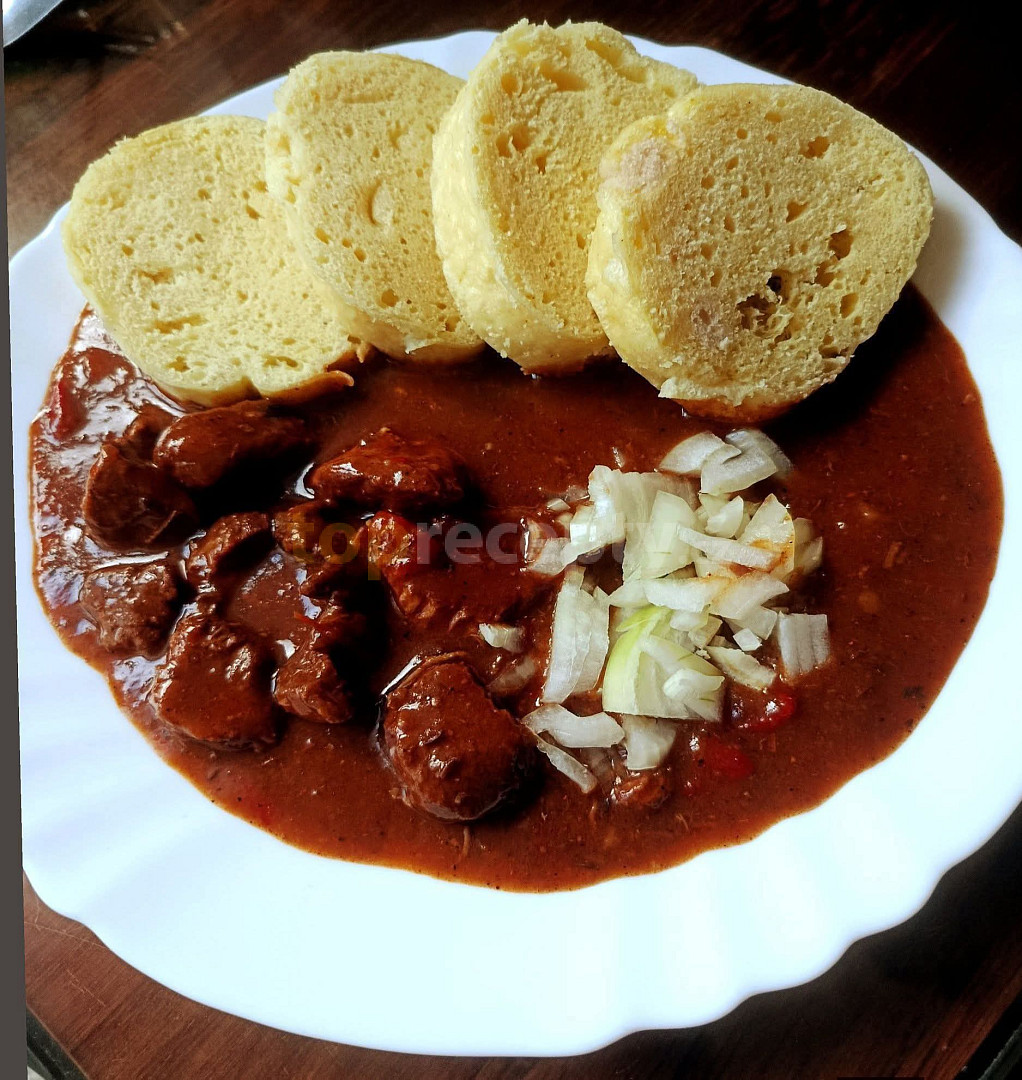 maso vepřové, cibule, česnek, hořčice, protlak rajčatový, koření černé, paprika sušená sladká, paprika čerstvá červená, rasco, bujón, feferonka, sůl, olej, vegeta