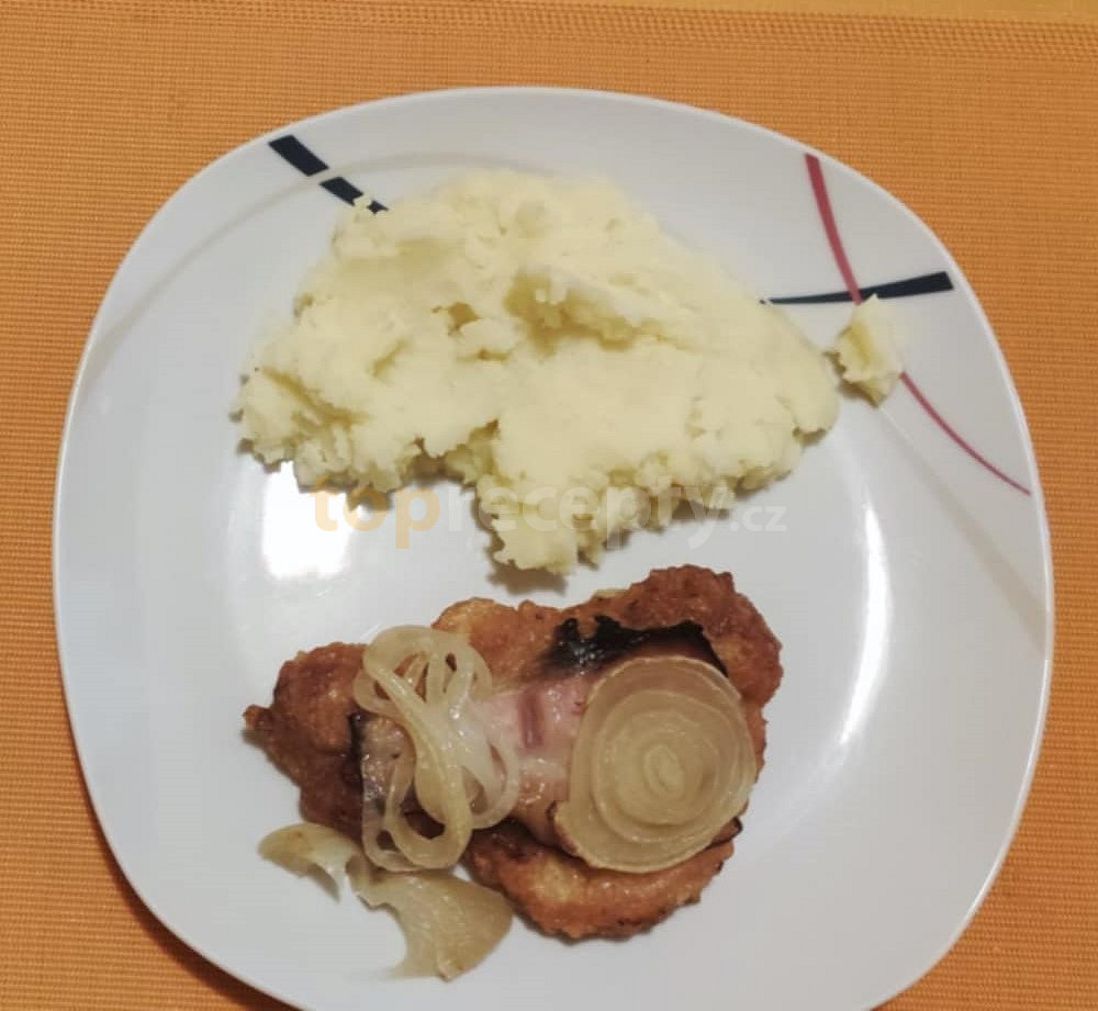 kotleta vepřová, cibule, paprika čerstvá červená, slanina anglická, sůl, pepř mletý, česnek granulovaný, olej, strouhanka, vejce