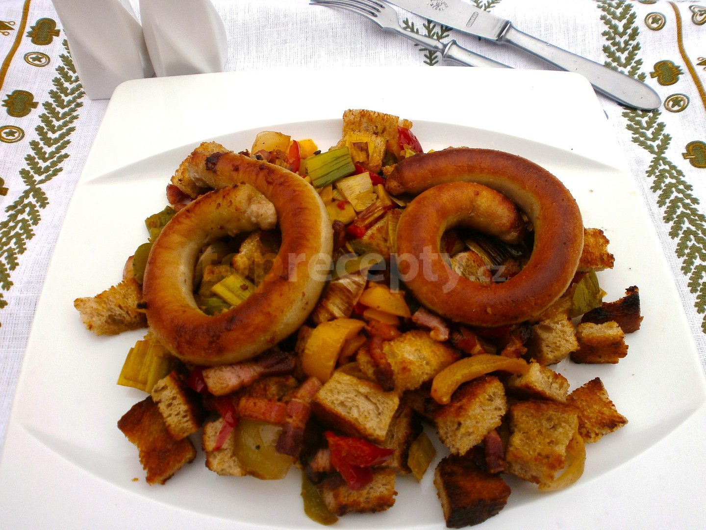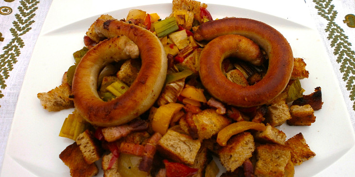klobása vinná, chléb, paprika čerstvá červená, paprika čerstvá žlutá, slanina anglická, pórek, cibule, česnek, olej, chilli, koření kari, sůl, pepř mletý