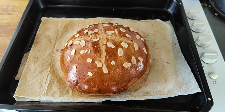 mouka hladká, mouka polohrubá, droždí čerstvé, mléko, cukr krupice, máslo, sůl, vejce, extrakt vanilkový, extrakt citronový, rozinky, mandle loupané, vejce, lupínky mandlové