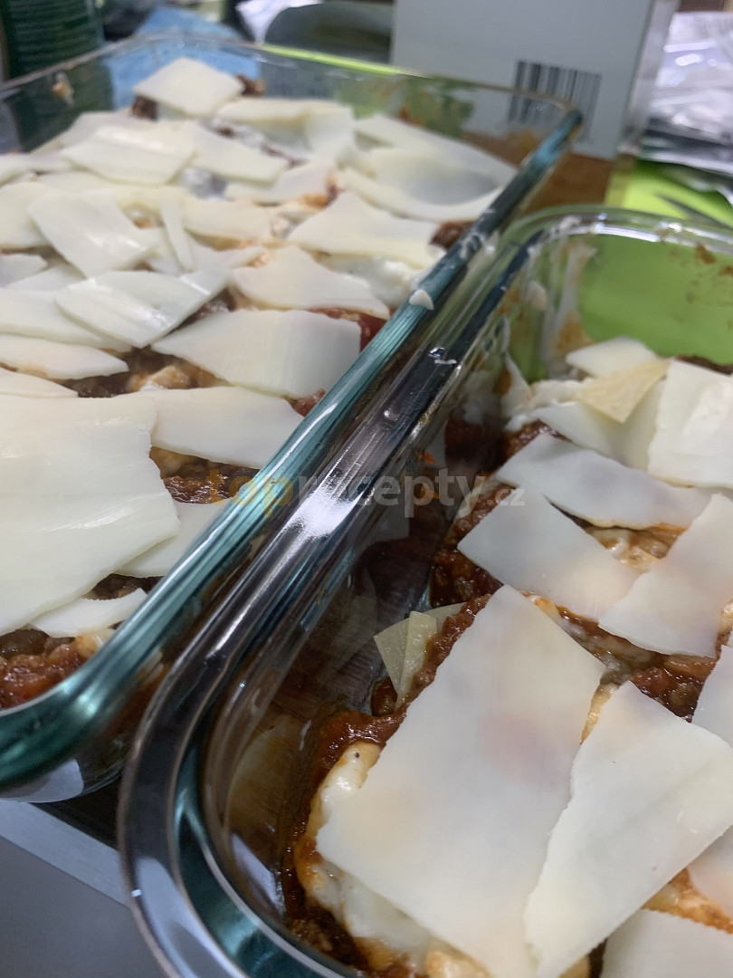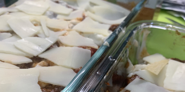 těstoviny lasagne, cibule, česnek, maso hovězí mleté, olej, koření oregáno, bazalka čerstvá, koření grilovací, sůl, pepř mletý, kečup sladký, rajče loupané, máslo, mouka hladká, mléko, ořech muškátový, sůl, pepř mletý, sýr tvrdý