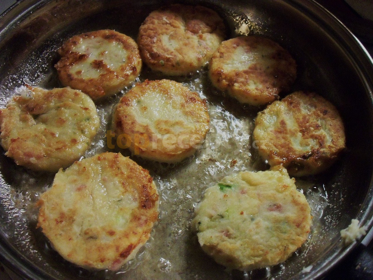 brambory, tvaroh nízkotučný, vejce, salám, sýr nastrouhaný, mouka polohrubá, bylinky, sůl, olej
