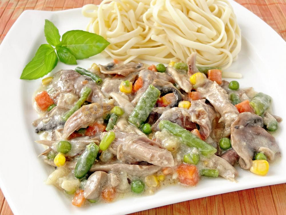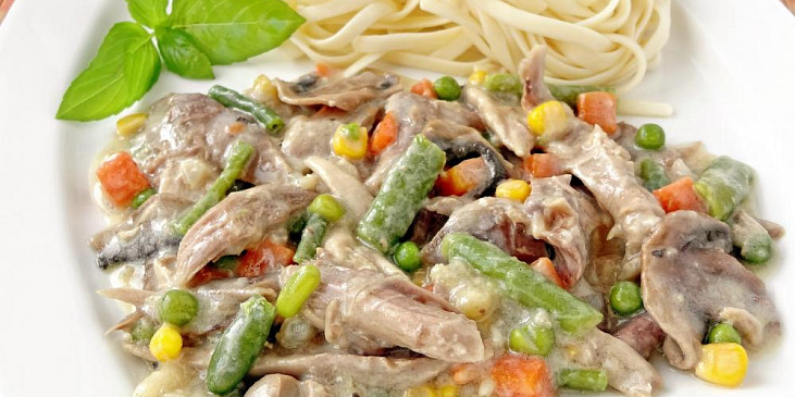 slepice, cibule, směs zeleninová mražená, žampiony sterilované, žloutek, mléko, smetana zakysaná, máslo, olej, mouka hladká, bobkový list, koření nové koření, pepř celý, sůl, pepř mletý, květ muškátový