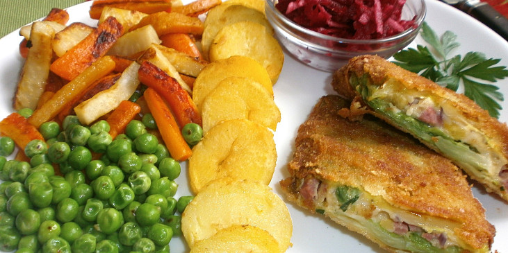 sýr tvrdý, vejce, hrášek, petrželka, paprika čerstvá červená, šunka, cibule červená, strouhanka, listy kapustové, vejce, strouhanka, mouka hladká, olej, sůl, pepř mletý