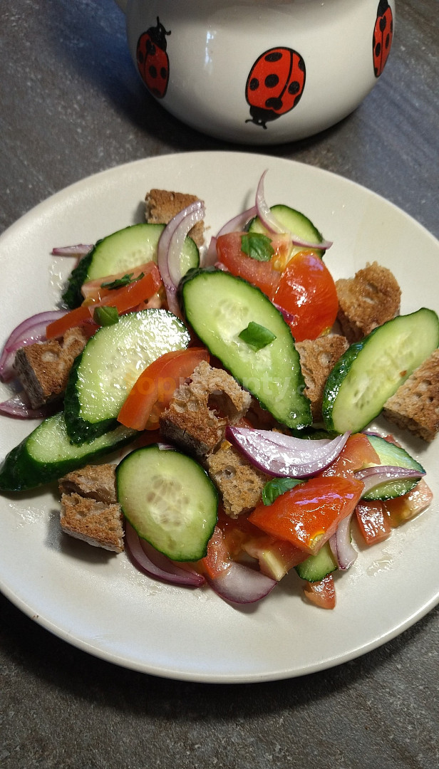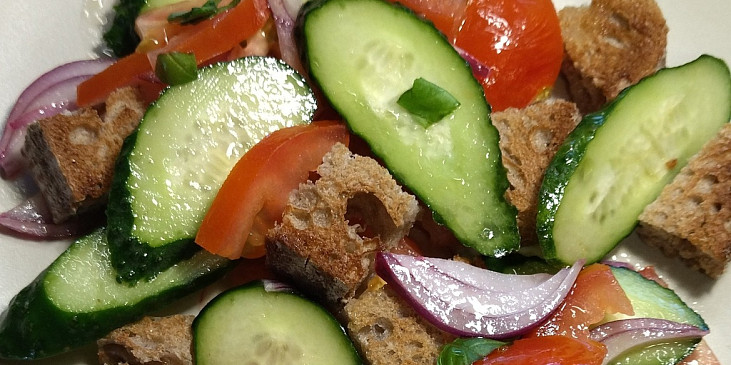 rajče, nať petrželová, cibule, kapary, sůl, pepř mletý, olej olivový, ocet vinný, česnek, chléb toustový tmavý, olej olivový