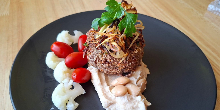 žampióny, cibule, vejce, sýr nastrouhaný, cibule sušená, petrželka, strouhanka, olej, sůl, pepř mletý, fazole ve slaném nálevu, máslo, smetana na vaření, sůl, pepř mletý, petržel, olej