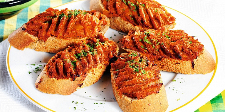 brokolice, paprika čerstvá zelená, brambory, cibule, protlak rajčatový, česnek, olej, saturejka, sůl, pepř mletý, bageta, petrželka, sýr strouhaný