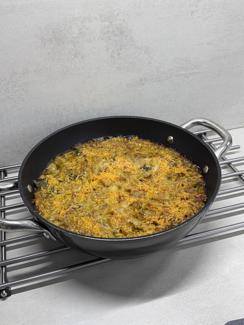 gnocchi, prsa kuřecí, smetana ke šlehání, gorgonzola, parmazán, sýr mozzarella, sýr chedar, špenát listový mražený, cibule, česnek, pesto bazalkové, sušená bazalka, koření oregáno sušené, ořech muškátový, olej olivový, pepř mletý, sůl