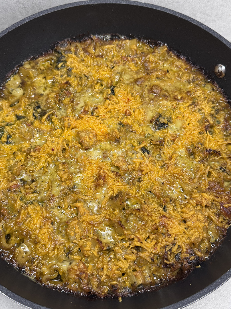 gnocchi, prsa kuřecí, smetana ke šlehání, gorgonzola, parmazán, sýr mozzarella, sýr chedar, špenát listový mražený, cibule, česnek, pesto bazalkové, sušená bazalka, koření oregáno sušené, ořech muškátový, olej olivový, pepř mletý, sůl
