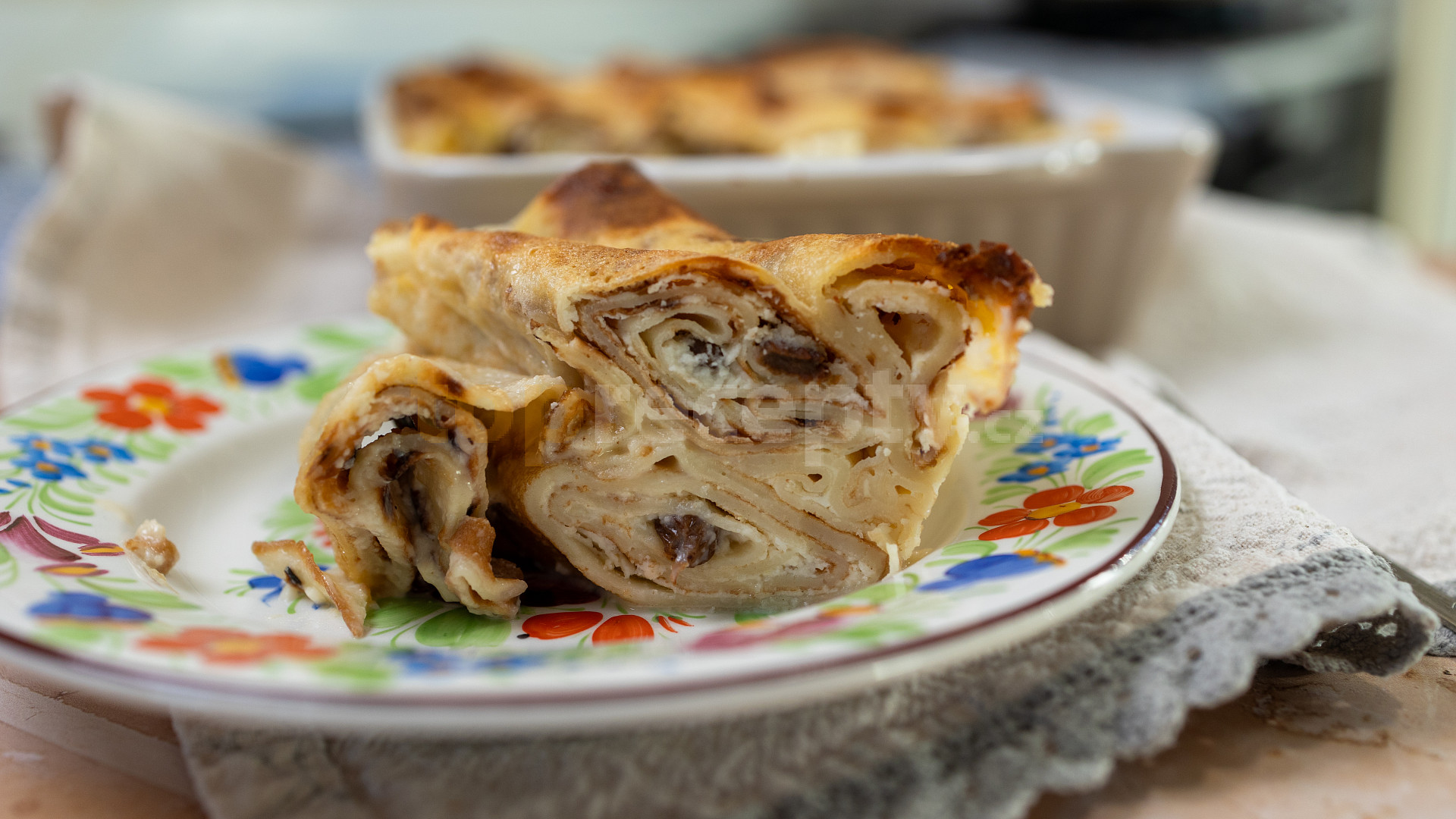 vejce, sůl, cukr moučkový, mléko, mouka polohrubá, tuk, tvaroh měkký, vejce, cukr moučkový, kůra citronová, ořech muškátový, rozinky, vejce, mléko, cukr moučkový, cukr vanilinový, cukr moučkový, cukr vanilinový