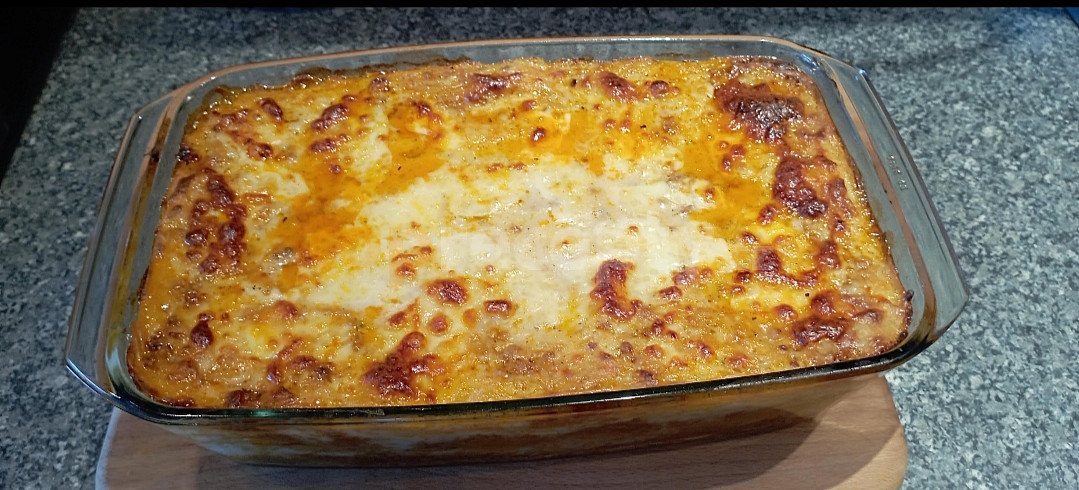 těstoviny špagety, maso hovězí mleté, cibule, mrkev, rajče, česnek, protlak rajčatový, máslo, mouka hladká, mléko, olej, sýr mozzarella, voda, sůl, pepř mletý, koření na špagety, ořech muškátový