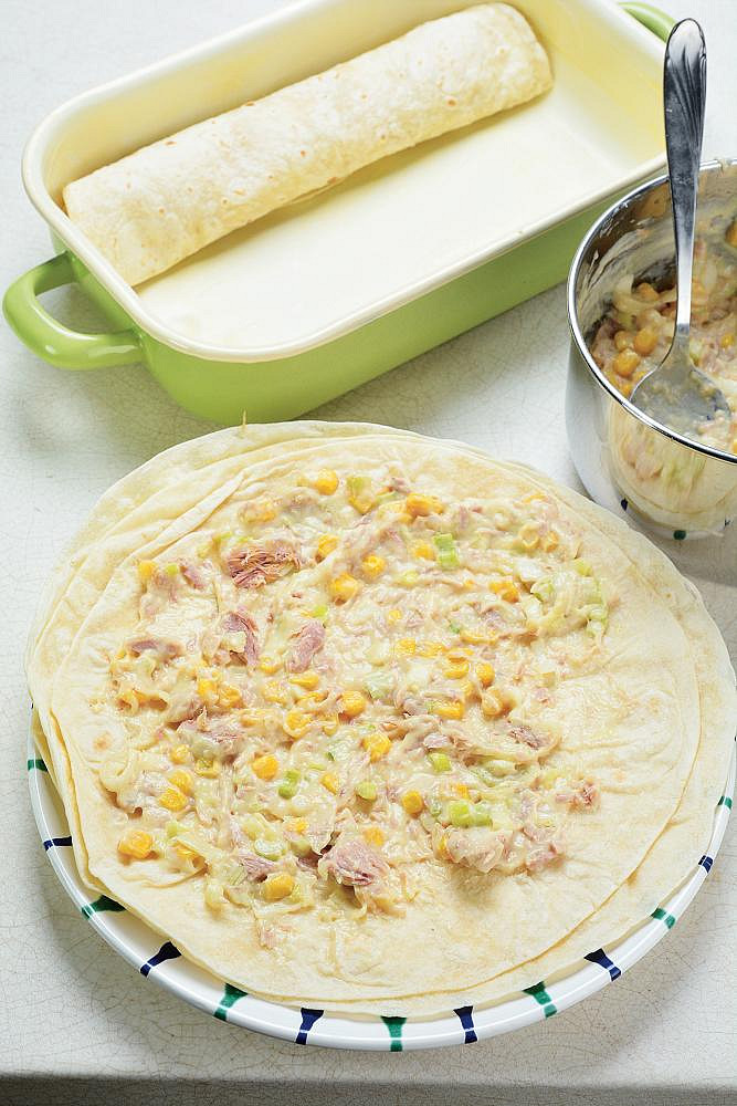 cibulka jarní, máslo, mouka hladká, mléko, hořčice dijonská, tuňák, kukuřice sterilovaná, tortilla, sýr tvrdý, sůl, pepř mletý
