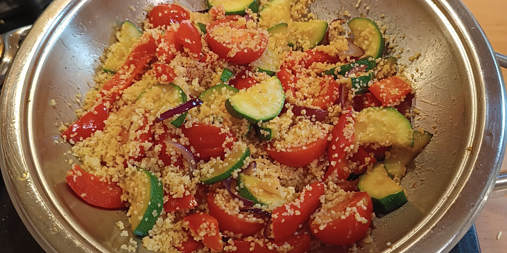 cuketa, paprika čerstvá žlutá, rajče, cibule červená, česnek, kuskus, vývar zeleninový, olej, pepř mletý, sůl, sýr strouhaný