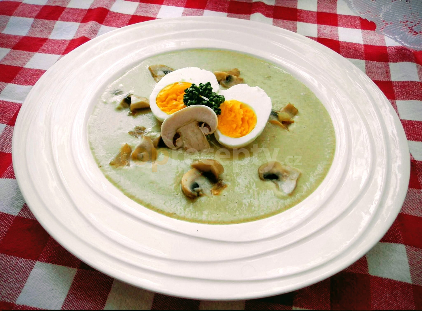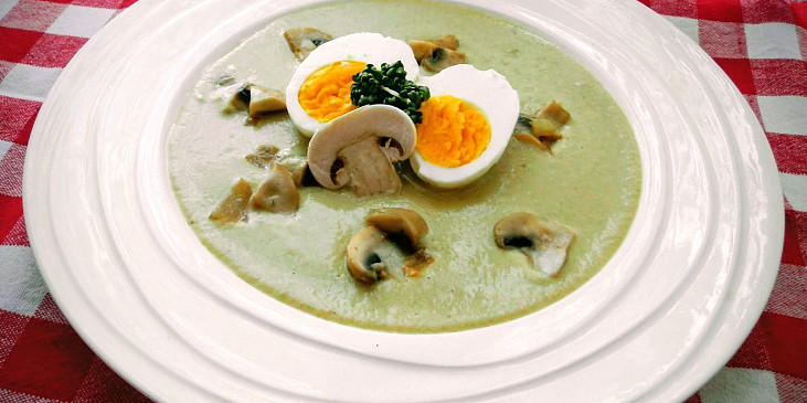 máslo, cibule, bulva celerová, celer řapíkatý, žampióny, koření houbová variace, vývar zeleninový, smetana ke šlehání, vejce, sůl, pepř mletý