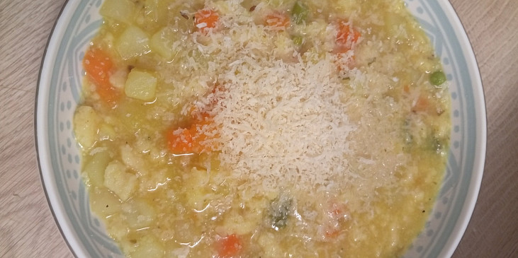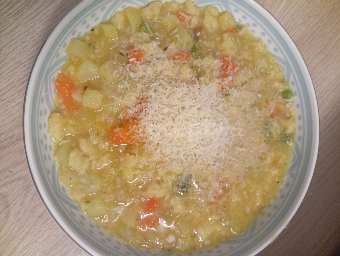 brambory, polévková zelenina, vývar zeleninový, sůl, pepř mletý, krupice dětská, vejce, mléko, sůl, sýr parmazán strouhaný