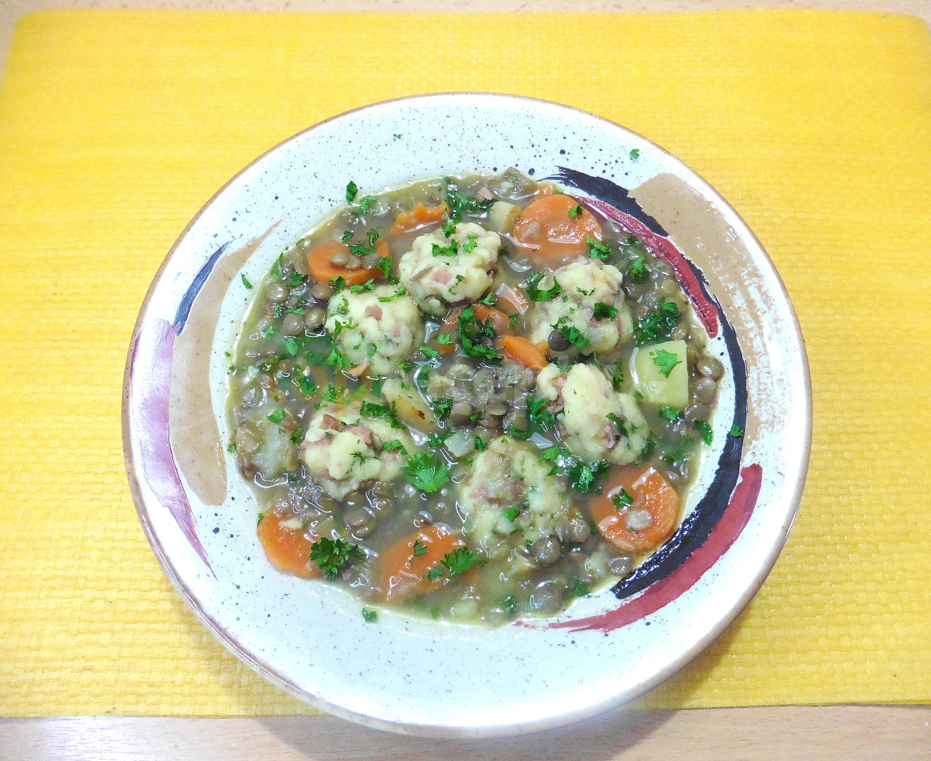 čočka, mrkev, petržel, celer, brambory, cibule, máslo, zelenina, petrželka, sůl, pepř mletý, vejce, voda, krupice, šunka, petrželka, květ muškátový, mouka hrubá, strouhanka, sůl, pepř mletý