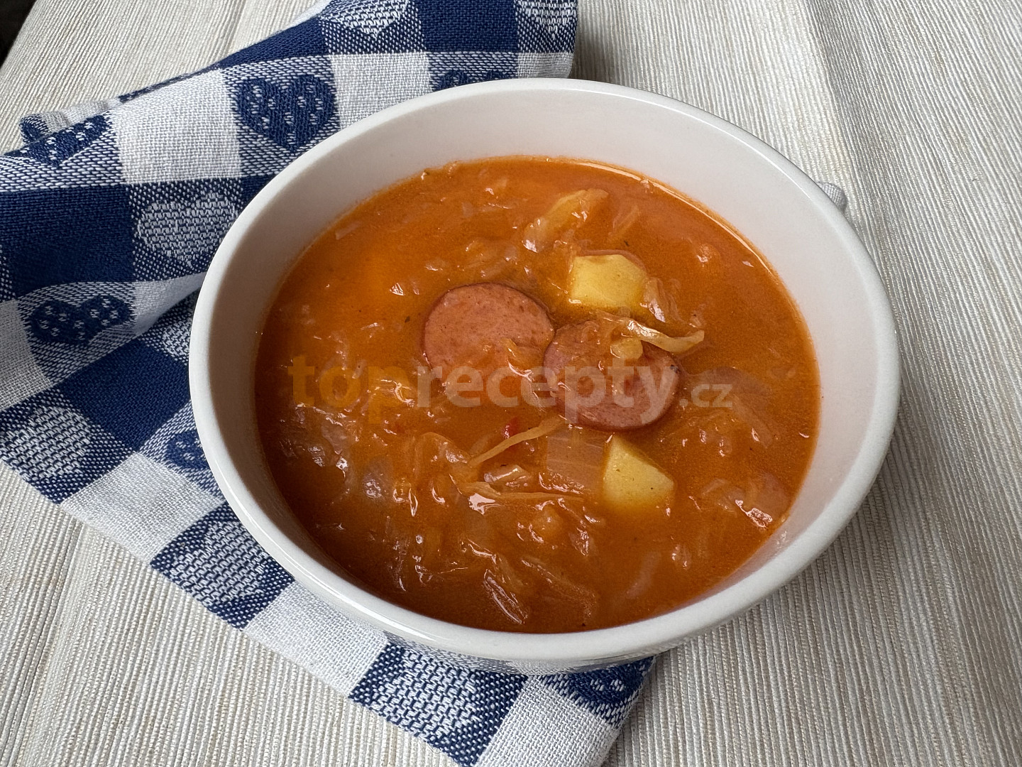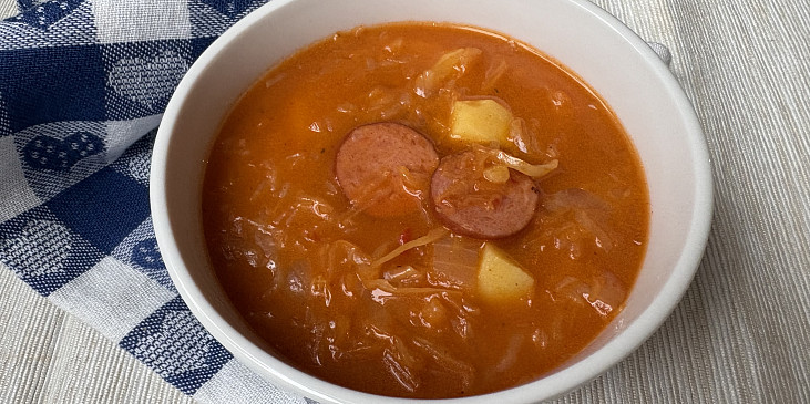 zelí kysané, klobása, brambory, bujón zeleninový, smetana zakysaná, smetana, mouka hladká, cibule, olej, sůl, pepř mletý, koření nové koření, bobkový list, paprika sušená sladká, chilli